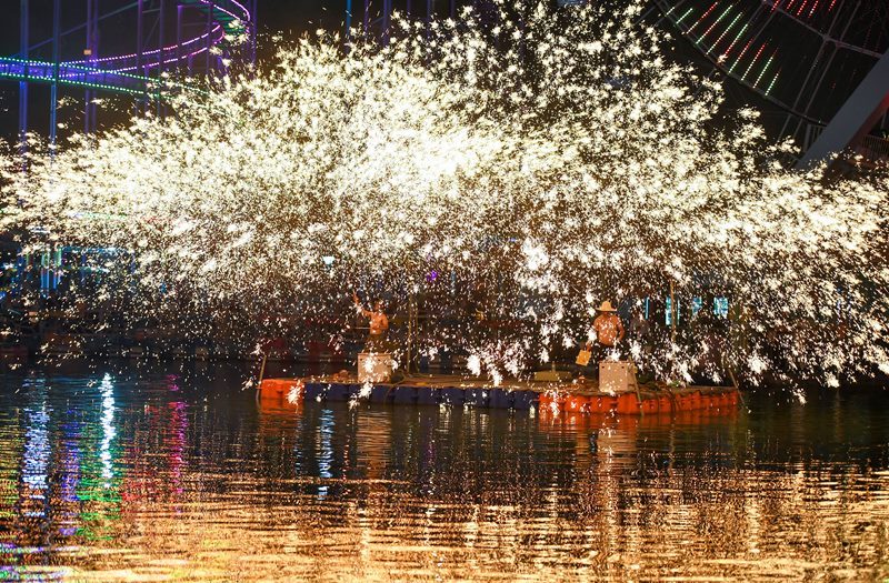10月2日,非遺傳承人在江蘇南京七橋甕濕地公園內(nèi)展示打鐵花技藝。