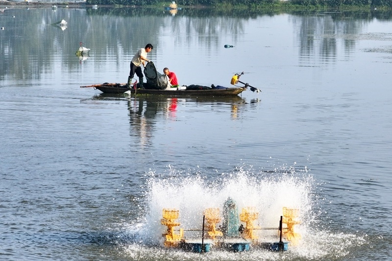 10月4日,蟹農(nóng)在江蘇省寶應(yīng)縣夏集鎮(zhèn)王營村養(yǎng)殖基地捕撈螃蟹(無人機(jī)照片)。
