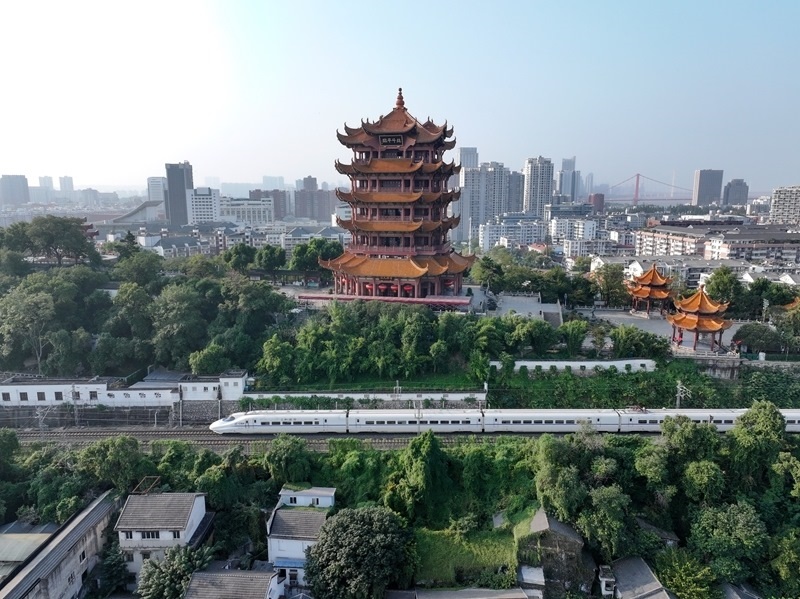 10月10日,動車組列車經過湖北省武漢市黃鶴樓(無人機照片)。