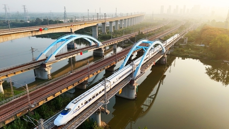 10月10日在江蘇南京拍攝的行駛中的動車組列車(無人機照片)。