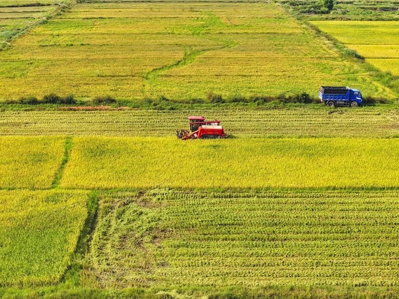 10月11日,湖南省衡陽市衡山縣白果鎮(zhèn)村民駕駛農(nóng)機收割稻谷(無人機照片)。