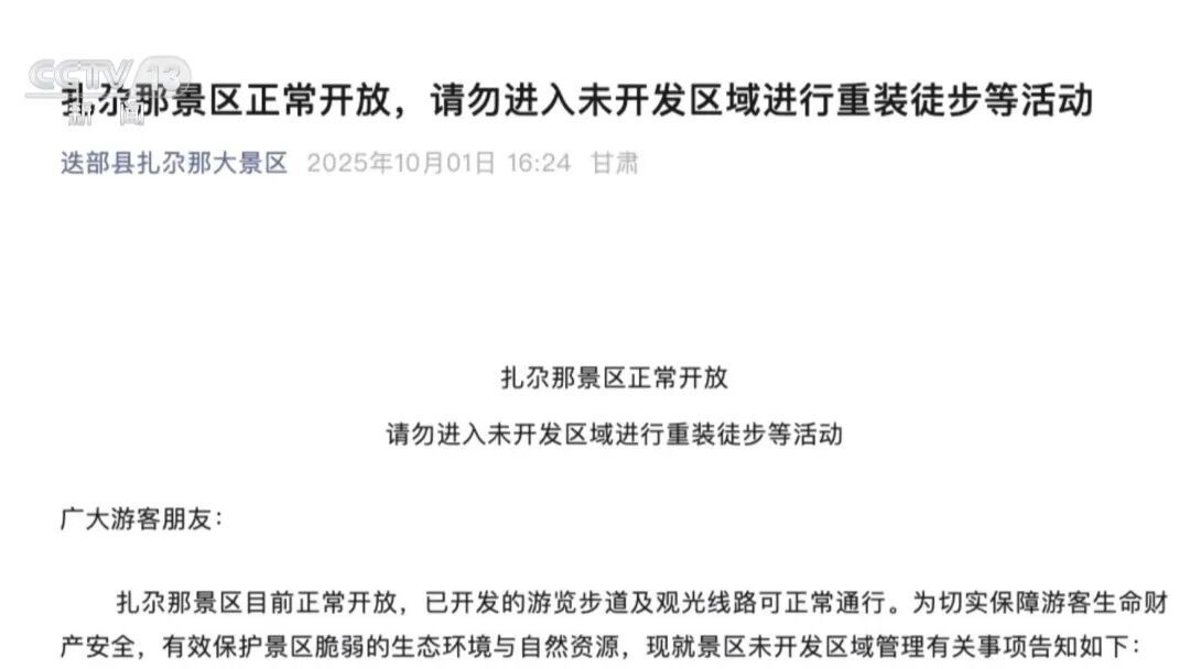 假期第一天,扎尕那景區(qū)宣布,嚴(yán)禁任何組織或個(gè)人未經(jīng)批準(zhǔn)擅自進(jìn)入其未開(kāi)發(fā)區(qū)域開(kāi)展重裝徒步等活動(dòng)。