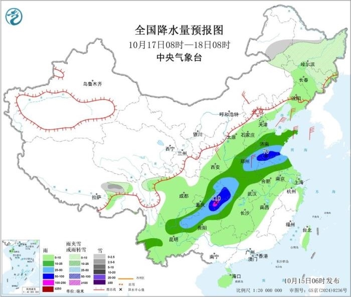 10月17日08時(shí)至18日08時(shí),東北地區(qū)中北部、內(nèi)蒙古東北部、西藏東北部等地的部分地區(qū)有小到中雪或雨夾雪;華北南部、黃淮、江淮北部、湖北、重慶、貴州中北部、湖南西北部、云南東北部和西南部等地部分地區(qū)有中到大雨,其中,山東南部、河南東部、安徽北部、江蘇北部、湖北西南部、湖南西北部、重慶東部、貴州東北部等地部分地區(qū)有暴雨或大暴雨(100~110毫米)。內(nèi)蒙古中東部、華北北部和東部、黃淮、江淮等地部分地區(qū)有4~6級(jí)風(fēng)。