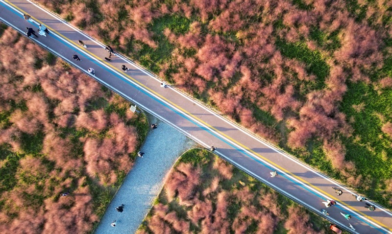 10月18日,游客在山東省東營(yíng)市東營(yíng)區(qū)耿井濕地粉黛亂子草“花?!迸恼沾蚩ǎo(wú)人機(jī)照片)。