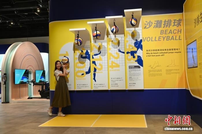 10月23日,香港科學(xué)館舉辦“國家發(fā)展成就系列──臻至完美:運(yùn)動與科學(xué)的交匯”展覽,展示全國運(yùn)動會的歷史及第十五屆全國運(yùn)動會香港賽區(qū)的賽事項目。圖為一名女士體驗沙灘排球項目,了解運(yùn)動員的跳躍高度。 中新網(wǎng)記者 李志華 攝
