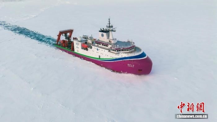 圖為2025年9月,“探索三號”在北極密集冰區(qū)破冰航行。(中國科學(xué)院深??茖W(xué)與工程研究所 供圖)