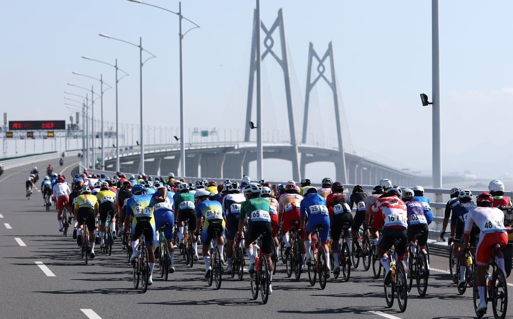 11月8日,參賽選手在港珠澳大橋騎行。當(dāng)日進(jìn)行的第十五屆全國(guó)運(yùn)動(dòng)會(huì)公路自行車(chē)男子個(gè)人賽,賽道全程231.8公里,選手經(jīng)過(guò)港珠澳大橋,跨越粵港澳三地。這是全運(yùn)會(huì)歷史上首次舉辦跨境比賽。新華社記者 毛思倩 攝