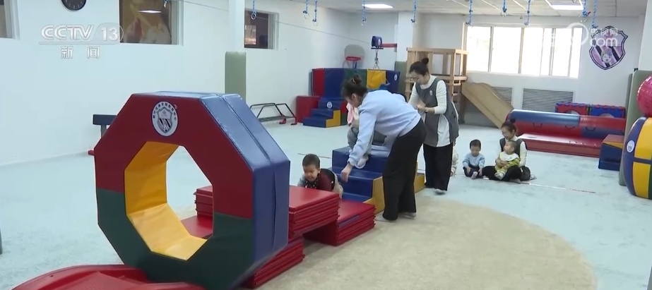 在遼寧沈陽這家托育中心,10多名1至3歲的寶寶正在早教老師帶領下做感統(tǒng)游戲。不滿兩歲的軒軒是托小班的“進步之星”。2024年7月入托時,他還是個見到陌生人就躲到老師身后的“害羞寶寶”,如今他不僅能主動向小伙伴揮手打招呼,還會主動分享玩具。