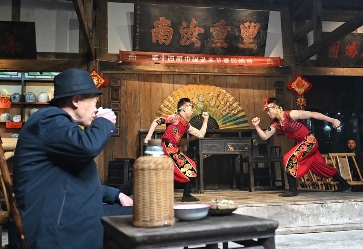 2025年10月25日,茶客在成都金琴老茶館一邊喝茶一邊觀看沈陽(yáng)雜技演藝集團(tuán)雜技演員表演的雜技節(jié)目《男子對(duì)手》,這是第十四屆中國(guó)藝術(shù)節(jié)惠民活動(dòng)之一。新華社記者 劉坤 攝