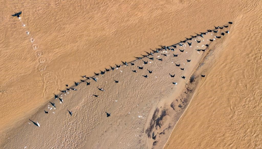 11月4日,在位于寧夏靈武市境內(nèi)的黃河,候鳥在河灘上駐足棲息(無人機(jī)照片)。新華社記者 楊植森 攝
