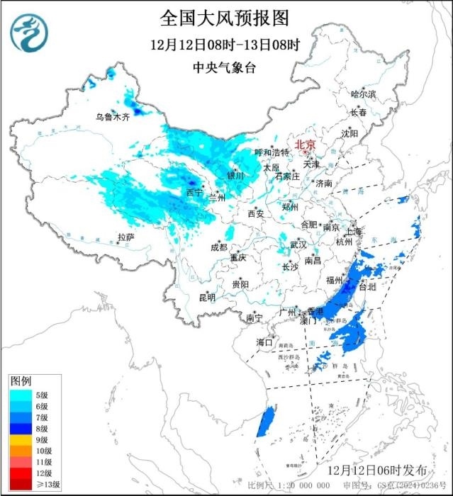 此外,12月12日08時(shí)至13日08時(shí),新疆北部、青海、西藏北部、內(nèi)蒙古西部、四川北部、甘肅東部、寧夏、陜西西北部等地部分地區(qū)有5~7級(jí)、陣風(fēng)8~9級(jí)的大風(fēng),其中,新疆山口地區(qū)陣風(fēng)可達(dá)10~11級(jí);東海南部部分海域、臺(tái)灣海峽、巴士海峽、南海東北部和中東部部分海域?qū)⒂?級(jí)、陣風(fēng)8~9級(jí)的大風(fēng)。中央氣象臺(tái)12月12日06時(shí)繼續(xù)發(fā)布大風(fēng)藍(lán)色預(yù)警。