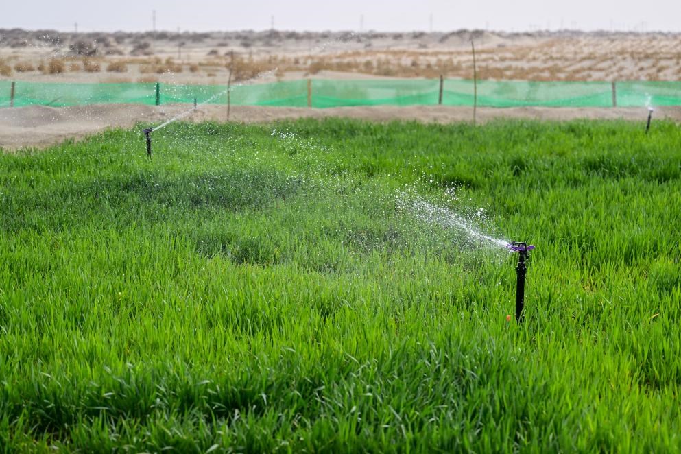 2025年4月13日,新疆阿克蘇地區(qū)沙雅縣沙生經(jīng)濟作物發(fā)展試驗基地,經(jīng)過苦咸水淡化技術(shù)處理的地下水噴灌出的小麥長勢良好。新華社記者丁磊 攝