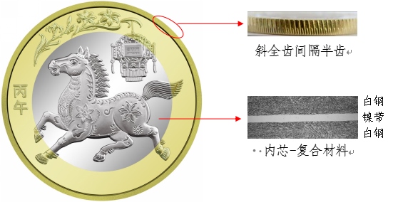 硬幣外環(huán)為黃銅合金,內(nèi)芯為具有獨(dú)特機(jī)讀性能的鎳帶復(fù)合白銅材料。防偽特征效果見圖1。