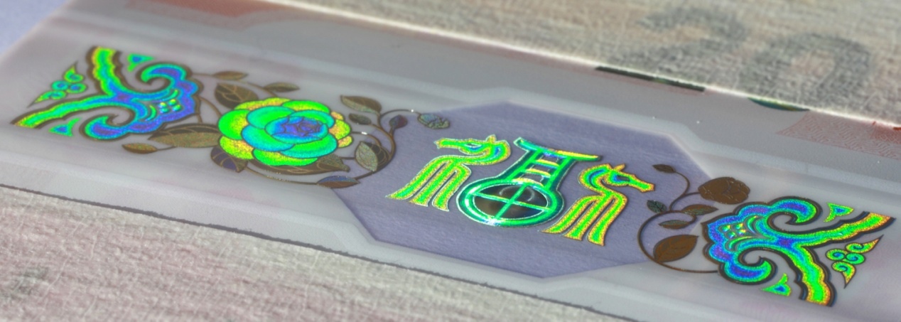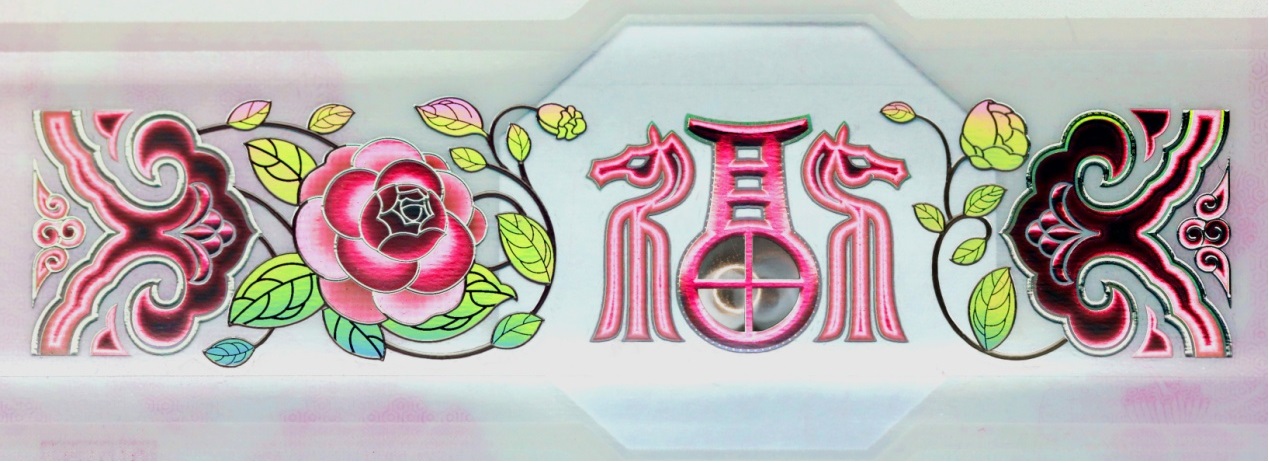 位于票面下方。改變觀察角度,票面正面可見“如意云紋”、“山茶花”與“福”字組成的裝飾紋樣呈現(xiàn)多色動(dòng)感特征?!案!弊窒虏俊疤铩弊謨?nèi)可見立體動(dòng)感高亮圓環(huán)效果。防偽特征效果見圖6。