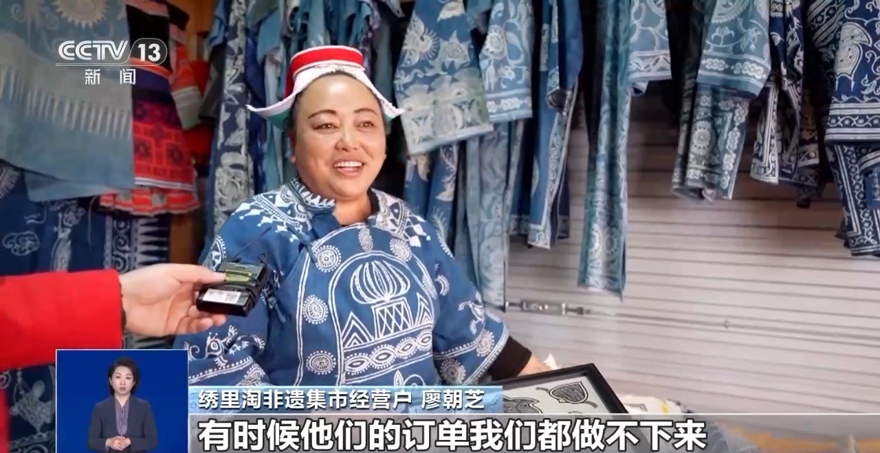 繡里淘非遺集市經營戶 廖朝芝:我們家主要是賣蠟染。顧客很喜歡,有時候給我們介紹訂單,有時候他們的訂單我們都做不下來。