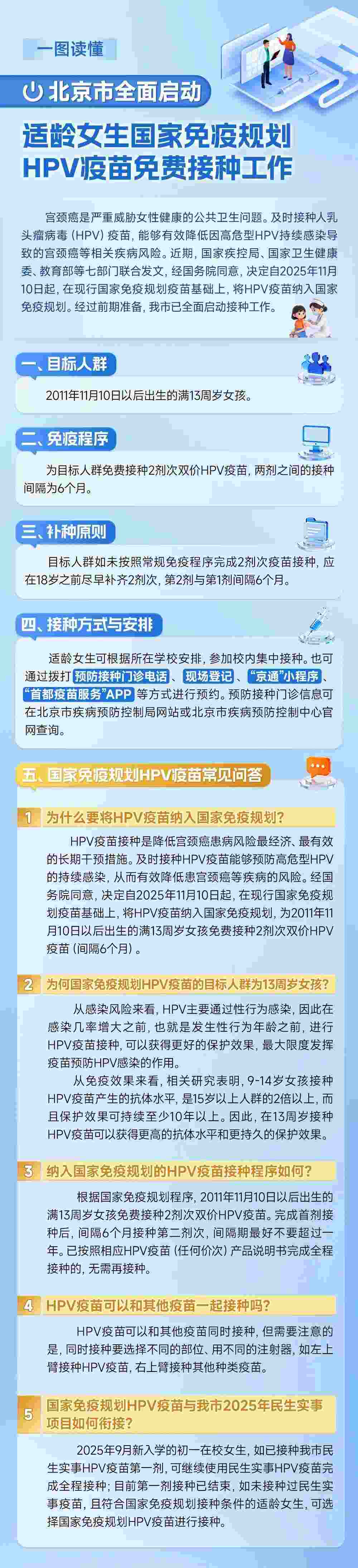 北京市疾控局1月9日介紹,北京已全面啟動適齡女生國家免疫規(guī)劃HPV(人乳頭瘤病毒)疫苗免費接種工作。