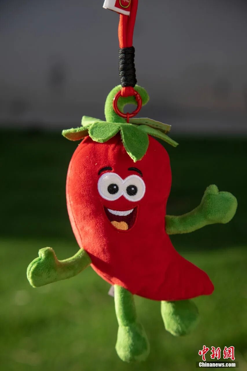 文創(chuàng)攤位上,紅紅的小辣椒有著綠色的“帽子”和四肢,它咧著嘴笑想和人們“椒”個朋友,手腳向外伸展,好像正在歡快地跳躍。