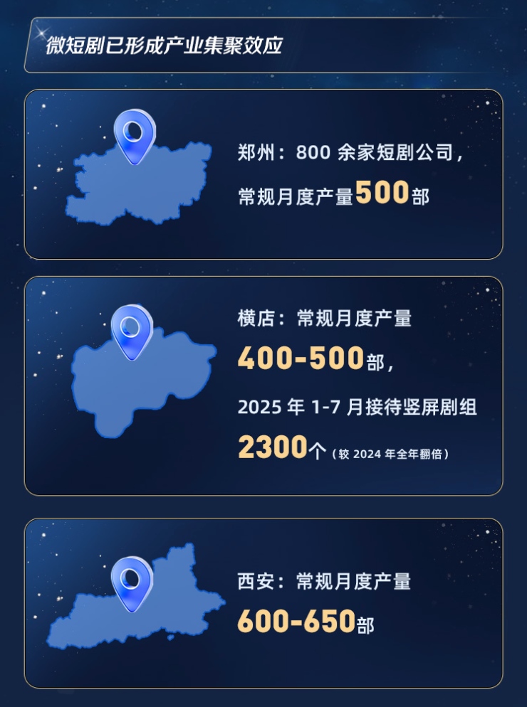 數(shù)據(jù)顯示,全國(guó)短劇月度產(chǎn)量已穩(wěn)定在約3000部,并在區(qū)域分工趨勢(shì)下,帶動(dòng)就業(yè)從一線城市向中西部擴(kuò)散。鄭州、西安、橫店等地,正成為這一產(chǎn)業(yè)地理格局的重要支點(diǎn)。