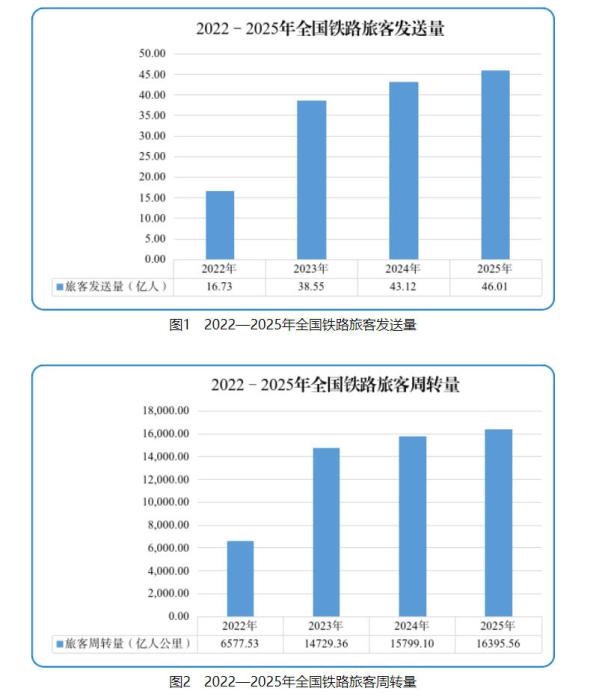 客運(yùn)方面。2025年,全國鐵路累計(jì)完成旅客發(fā)送量46.01億人,同比增長6.7%;完成旅客周轉(zhuǎn)量16395.56億人公里,同比增長3.8%。12月份,完成旅客發(fā)送量3.23億人,同比增長8.5%;完成旅客周轉(zhuǎn)量1015.59億人公里,同比增長6.0%。