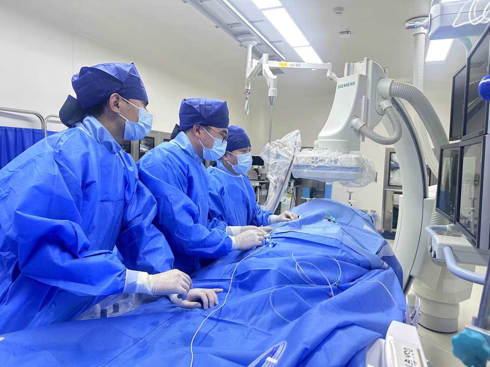 中山大學(xué)附屬第一醫(yī)院血管外科常光其教授、李梓倫教授團隊順利開展中國大陸首例EKOS超聲波輔助溶栓系統(tǒng)治療肺動脈栓塞。新華網(wǎng)發(fā)(受訪者供圖)