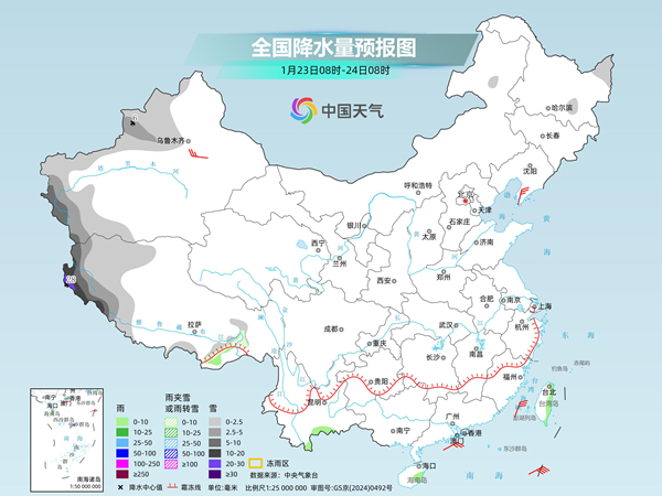明天,新疆西部、西藏西部等地部分地區(qū)有小到中雪或雨夾雪,其中,新疆南疆西部山區(qū)、西藏西部等地部分地區(qū)有大到暴雪,局地大暴雪。云南南部、海南島東部、臺灣島東部等地部分地區(qū)有小雨。