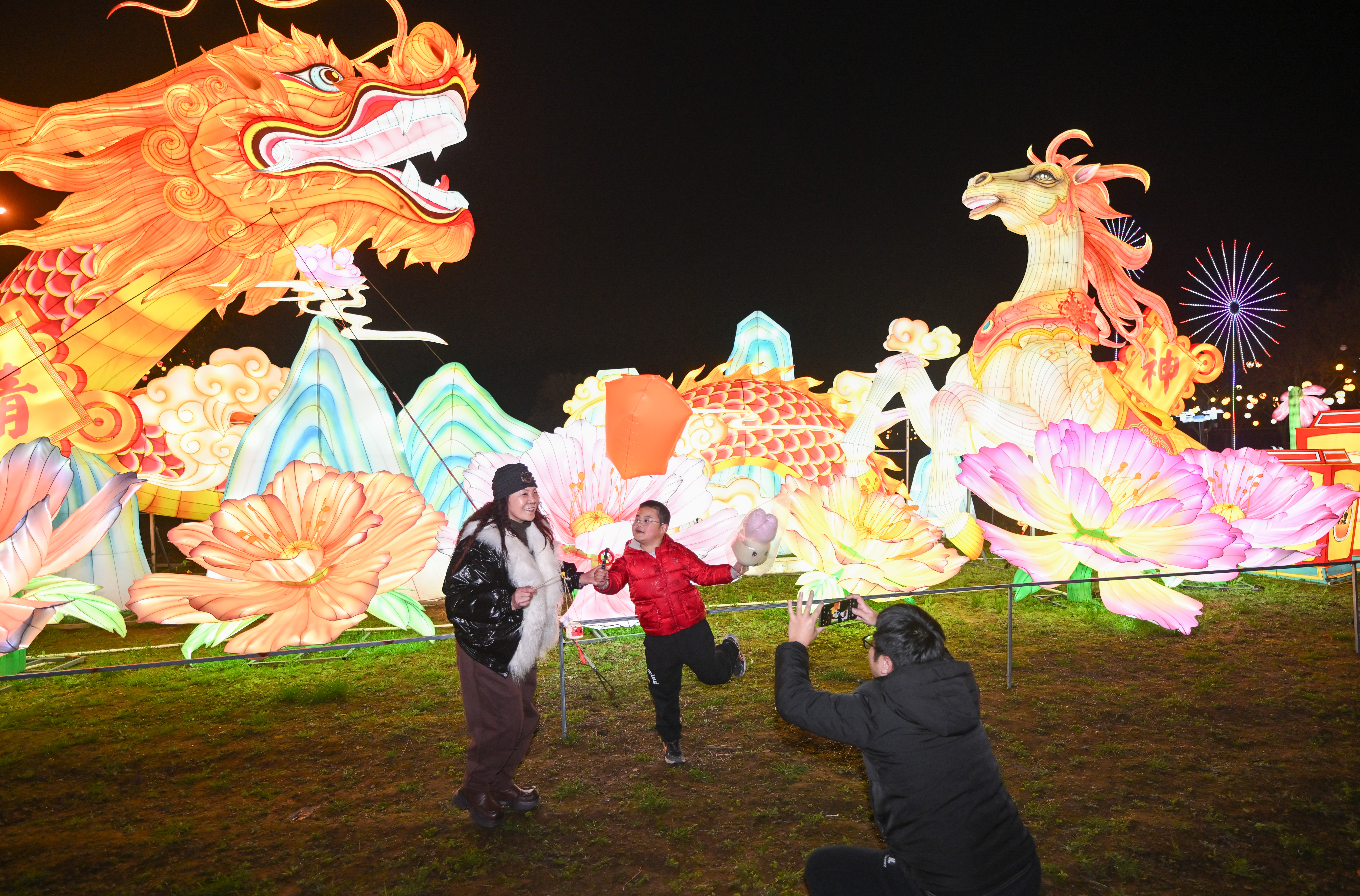 ▲銅梁第十二屆龍燈藝術節(jié)現(xiàn)場,市民與《龍馬精神》組燈合影。記者 謝智強 攝/視覺重慶