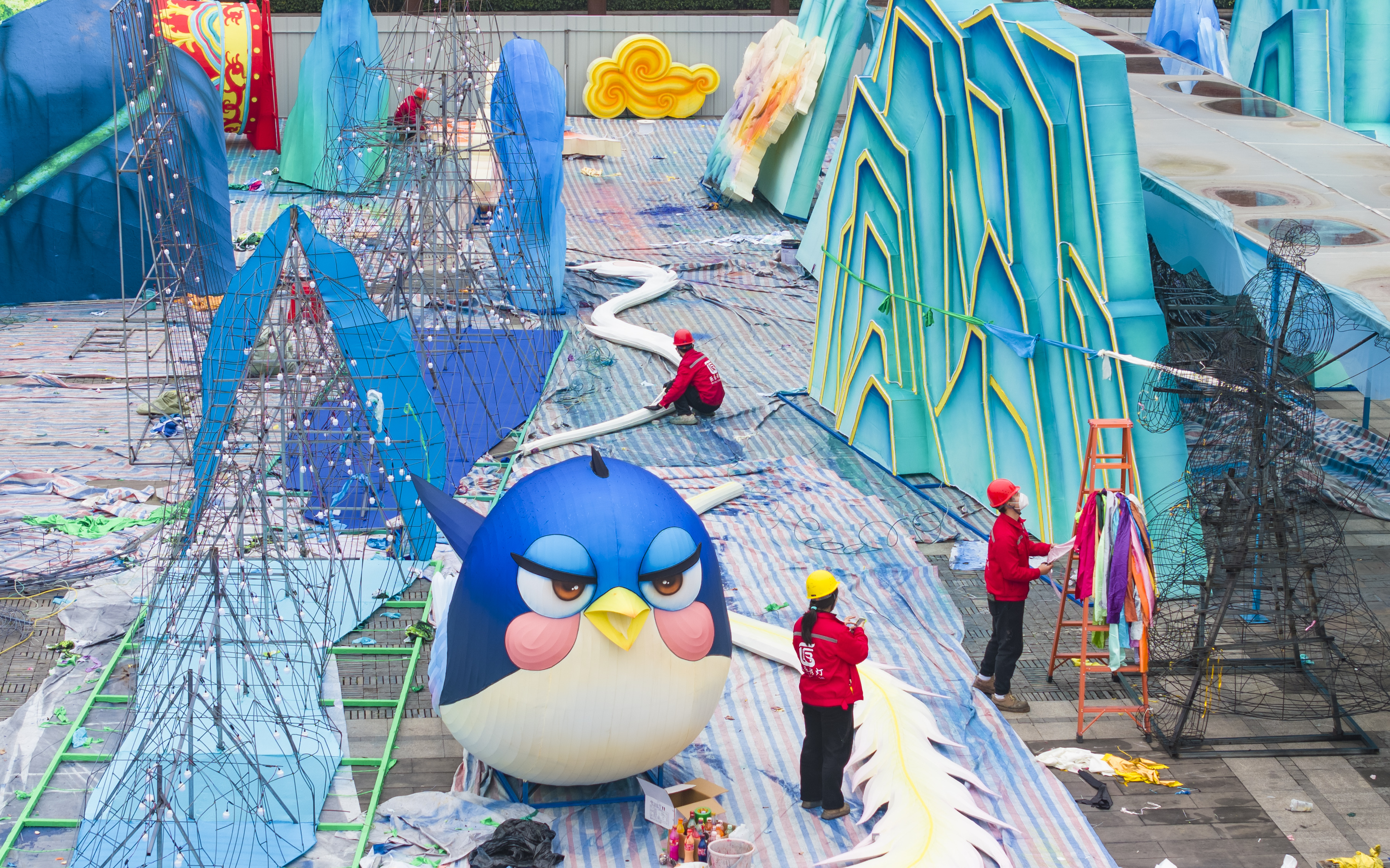 1月23日晚,自貢中華彩燈大世界火樹銀花。流光溢彩的燈海盛景,拉開了第32屆自貢國際恐龍燈會亮燈暨四川省迎春文旅促消費活動的序幕。在200多公里外的重慶園博園龍景湖畔,焊槍滋滋作響,火星如流星濺落。自貢彩燈匠人王東瞇著眼,用鉗子彎折著一根根鐵絲,在他身后,一尊高達15米、寬約40米的《巾幗良玉》燈組巍然屹立,一臺西部最大的水上燈會正在緊鑼密鼓籌備之中。
