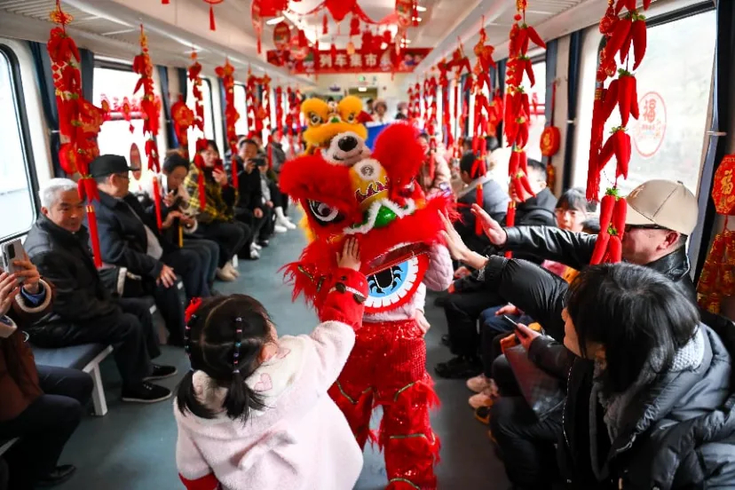 2024年2月23日,5630次列車上,旅客與舞獅互動。當日,在元宵節(jié)到來之際,形式多樣的鬧元宵活動在貴州遵義開往重慶西的5630次公益性“慢火車”上舉行,吸引不少旅客參與其中,感受濃濃節(jié)日氣氛。 中新社記者 何蓬磊 攝
