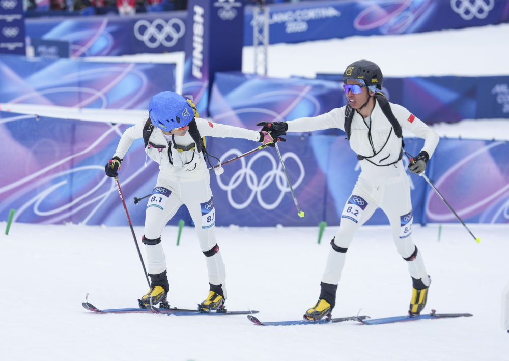 獲得米蘭-科爾蒂納冬奧會(huì)滑雪登山混合接力比賽第八名的中國組合次旦玉珍(左)/布魯爾在終點(diǎn)處合影(2026年2月21日攝)。新華社記者 胡虎虎 攝