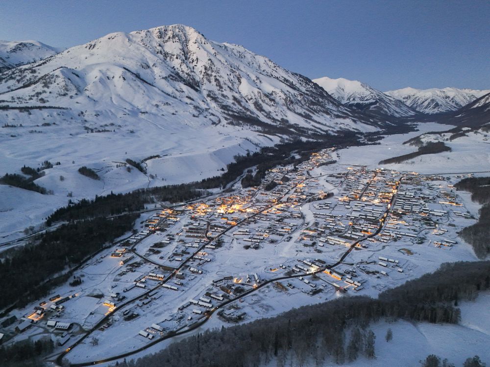 夜幕降臨,新疆阿勒泰將軍山國際滑雪度假區(qū)即將開啟夜場(chǎng)運(yùn)營(2025年1月24日攝,無人機(jī)照片)。新華社記者 胡虎虎 攝