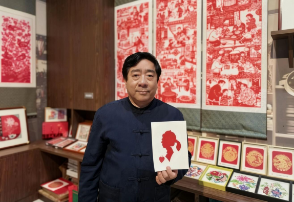 工坊中央,克樹利被層層觀眾圍住,叫好聲此起彼伏。只見他手持一張巴掌大的紅紙,目光在人群中一掃,隨手拉住前排一位扎馬尾辮的小姑娘,手上的剪刀便如游龍般翻飛起來。不畫底稿、不做標(biāo)記,紅紙在他手中旋轉(zhuǎn)變形,幾十秒的工夫,一把剪刀開合之間,一張惟妙惟肖的人影剪紙便已成型——俏皮的馬尾辮、抿著嘴的笑臉,甚至連小姑娘頭頂上的發(fā)卡都清晰可見?!跋瘢√窳?!”圍觀人群中爆發(fā)出一陣熱烈的掌聲,小姑娘捧著剪紙,喜笑顏開。