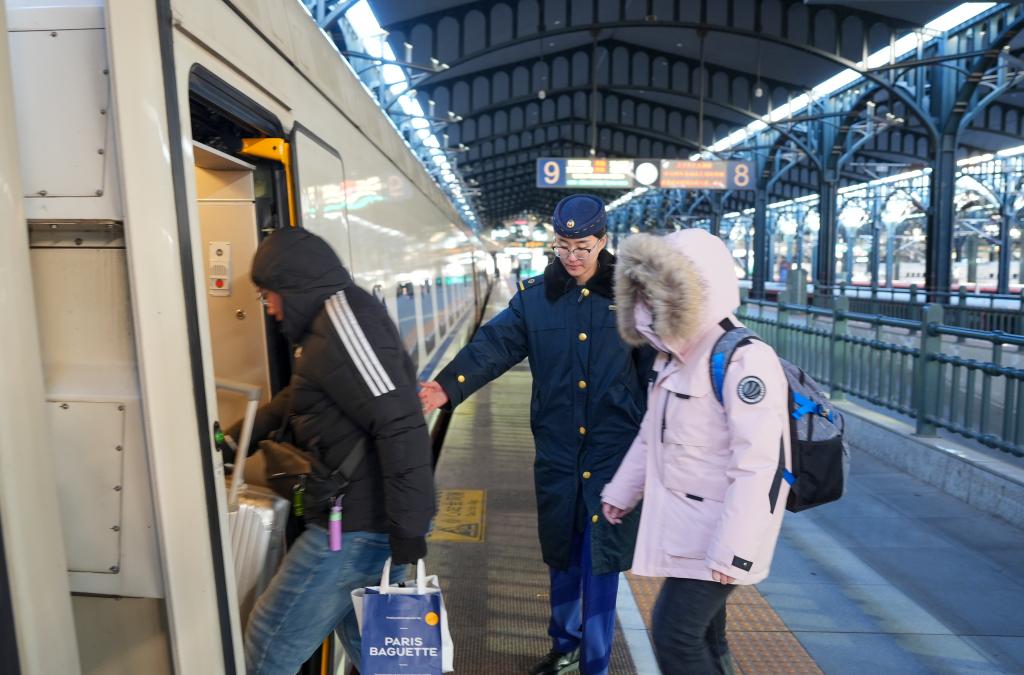 中國(guó)鐵路哈爾濱局集團(tuán)有限公司工作人員(中)在哈爾濱火車站為旅客服務(wù)。李昕洋 攝