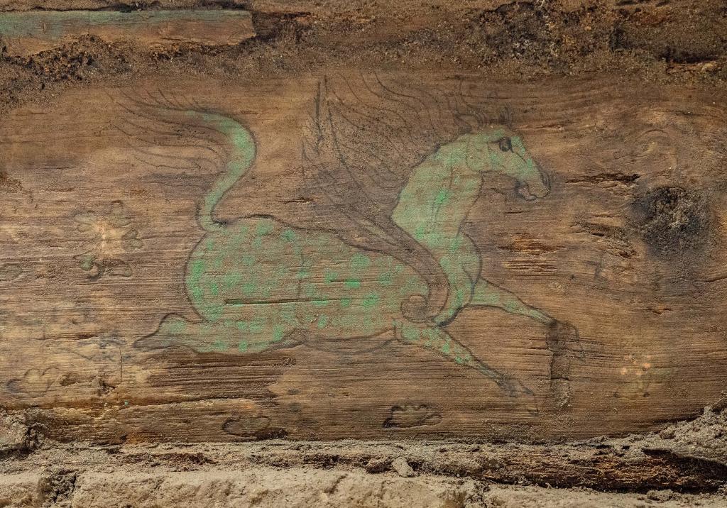 這是木棺座壸門內(nèi)的彩繪“翼馬”圖案。新華社記者 李賀 攝