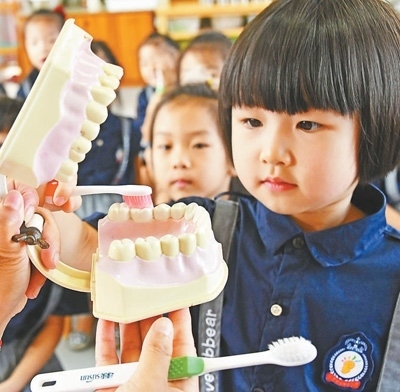 浙江省臺(tái)州市仙居縣迎暉幼兒園的小朋友正在學(xué)習(xí)正確的刷牙方法。 王華斌攝(人民視覺(jué))