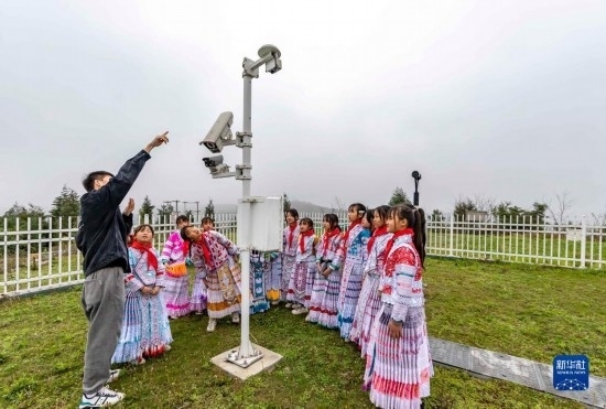 3月23日,學(xué)生在貴州省黔西市氣象局綜合氣象觀測(cè)站聽工作人員講解智能觀測(cè)儀工作原理。