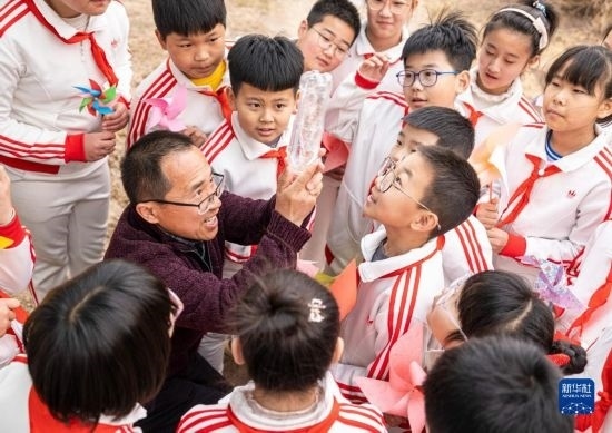 3月23日,在河北省唐山市豐南區(qū)氣象科普公園,工作人員和學(xué)生一起互動(dòng)游戲。