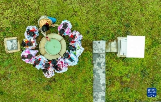 3月23日,學(xué)生在貴州省黔西市氣象局綜合氣象觀測(cè)站觀看大型蒸發(fā)皿(無人機(jī)照片)。