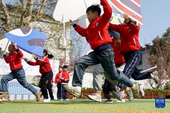 3月31日,徐州市漢橋小學(xué)的學(xué)生進(jìn)行“列車競速”游戲。