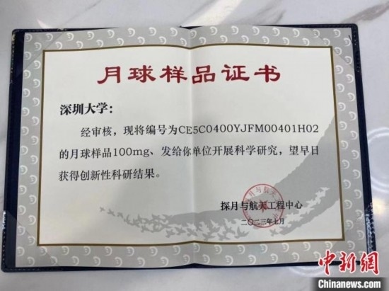 月球樣品證書。深圳大學(xué)供圖