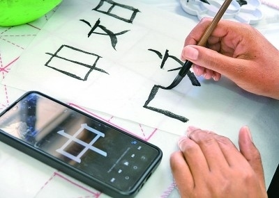 英國倫敦,一名學(xué)生在2023年“國際中文日”英國主題活動(dòng)上展示自己的書法。新華社發(fā)