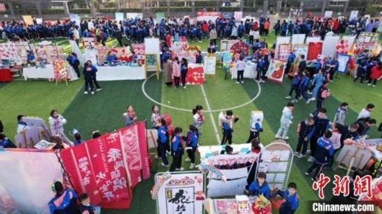 3月11日,航拍熱鬧的校園“廟會”現(xiàn)場。中新網記者 翟羽佳 攝