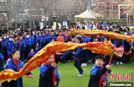 3月11日,學生們舞龍,感受傳統(tǒng)文化魅力。中新網記者 翟羽佳 攝
