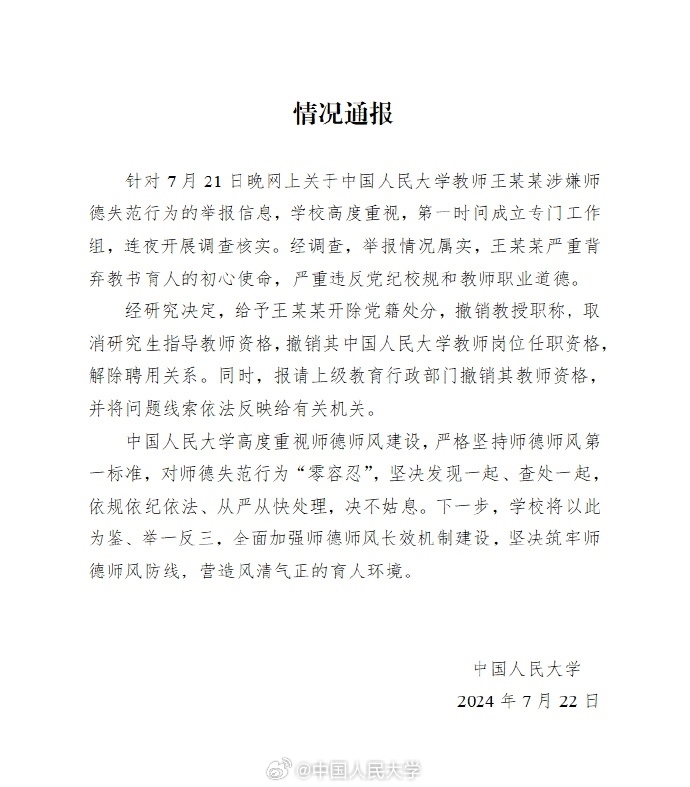 通報中稱,學(xué)校高度重視,第一時間成立專門工作組,連夜開展調(diào)查核實。經(jīng)研究決定,給予王某某開除黨籍處分,撤銷教授職稱,取消研究生指導(dǎo)教師資格,撤銷其中國人民大學(xué)教師崗位任職資格,解除聘用關(guān)系。同時,報請上級教育行政部門撤銷其教師資格,并將問題線索依法反映給有關(guān)機(jī)關(guān)。