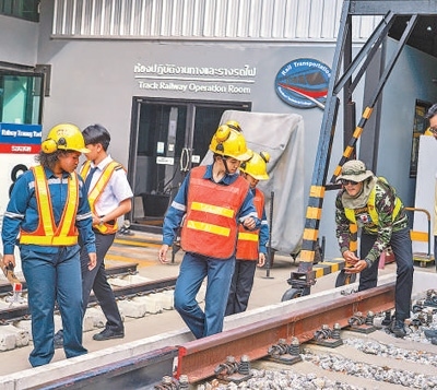 泰國春武里技術(shù)學(xué)院與中國多所鐵道學(xué)院保持技術(shù)交流。圖為軌道專業(yè)的學(xué)生們進(jìn)行實(shí)操訓(xùn)練。