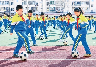 新學(xué)期伊始,河北省秦皇島市海港區(qū)耀華小學(xué)以足球素質(zhì)操等活動結(jié)合十余種自主游戲項目,讓學(xué)生在趣味活動中提升體能。圖為2月18日,學(xué)生在展示足球素質(zhì)操。