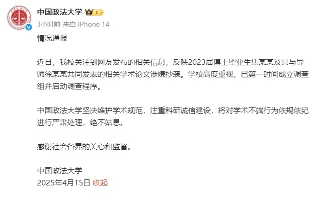 人民網(wǎng)北京4月15日電 (記者孫競)今天上午,中國政法大學發(fā)布情況通報稱,該校關注到網(wǎng)友發(fā)布的相關信息,反映2023屆博士畢業(yè)生焦某某及其與導師徐某某共同發(fā)表的相關學術論文涉嫌抄襲。學校高度重視,已第一時間成立調(diào)查組并啟動調(diào)查程序。