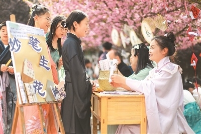 近年來,為更好地傳承詩歌文化,貴州省黔西市觀音洞鎮(zhèn)沙井小學每年春天都會舉辦校園詩歌文化節(jié)系列活動,老師帶領學生身著漢服寫詩歌,朗誦詩歌,猜詩歌謎語。圖為學生在向老師朗誦自己寫的詩歌。