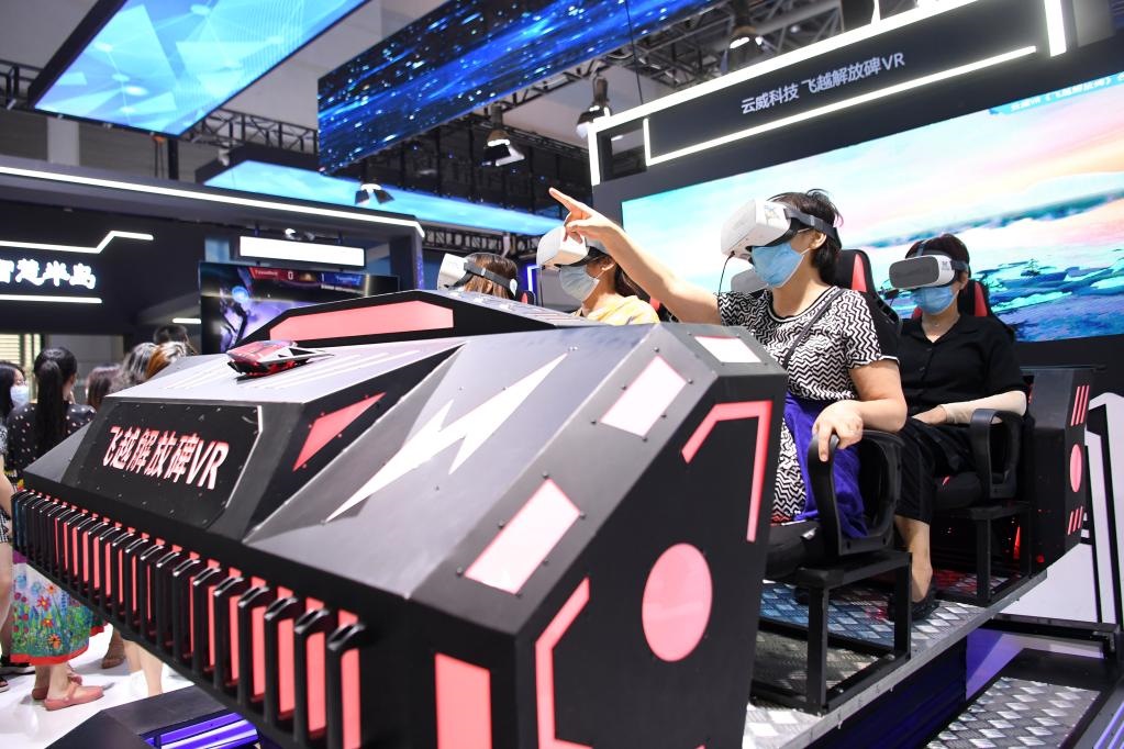 觀眾在2021智博會(huì)上通過(guò)VR技術(shù)體驗(yàn)重慶美景。新華社記者 唐奕 攝