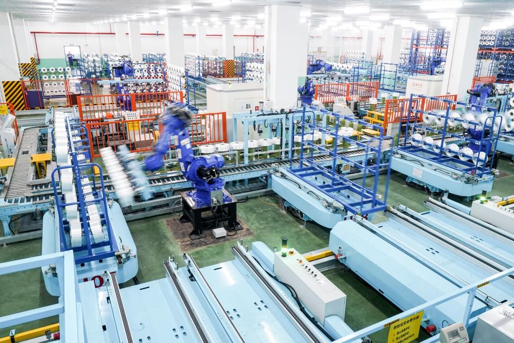 位于江蘇省蘇州市吳江區(qū)盛澤鎮(zhèn)的一家智能車間,機(jī)器人在車間內(nèi)自動(dòng)作業(yè)。新華社記者 李博 攝
