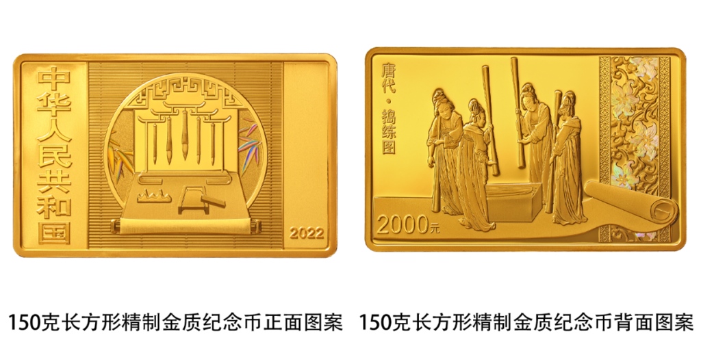 該套金銀紀念幣正面圖案均為筆、墨、紙、硯造型,輔以竹葉、窗等裝飾組合設計,背面圖案則各有特色。一枚150克長方形金質(zhì)紀念幣背面圖案為《搗練圖》中搗練場景,襯以裝飾紋樣組合設計,并刊“唐代·搗練圖”字樣及面額。